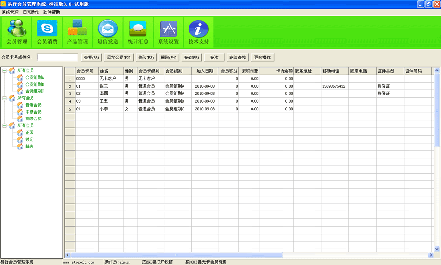 易行会员管理系统是一款功能强大的会员管理软件,该软件支持储值卡、折扣卡、计次卡等会员卡。集成会员信息管理和会员消费管理,支持无卡客户消费,软件界面美观大方,操作简单方便。能满足销售,餐饮,美容美发,健身,桑拿,娱乐,各种服务业进行会员制管理,会员卡管理,会员消费管理,会员积分管理的需求。 科学的管理方法会给您带来无限的效益,易行会员管理软件是您明智的选择。 1、强大的会员管理功能,支持折扣卡、储值卡和计次卡。 2、储值卡和计次卡可设卡密码。 3、支持各种IC卡,磁卡读写器,条形码扫描器等硬件。 4、会员积分管理,支持会员积分兑换。 5、强大的会员查询模块,使会员查询更为方便快捷。 7、支持会员数据的Excel格式导入导出。 8、系统提醒,支持会员生日提醒,会员卡到期提醒,自定义提醒。 9、支持短信群发,短信内容可以针对每个会员自定义。 10、支持用户操作日志。 11、支持多用户操作,各个用户根据权限使用相应的功能模块。 |