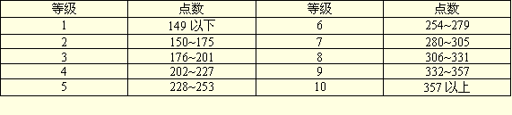 工作等级与点数配置。根据点数法原则,点数相同的工作者之间工资报酬相同,因此,必须对不同级别的工作值加以区分。例如,将满分定为500分,将工作值分为10个等份,每等之差均为25分,点数越少者,等级越低。第一等为140分以下;第十等为357点以上,如下表所示: